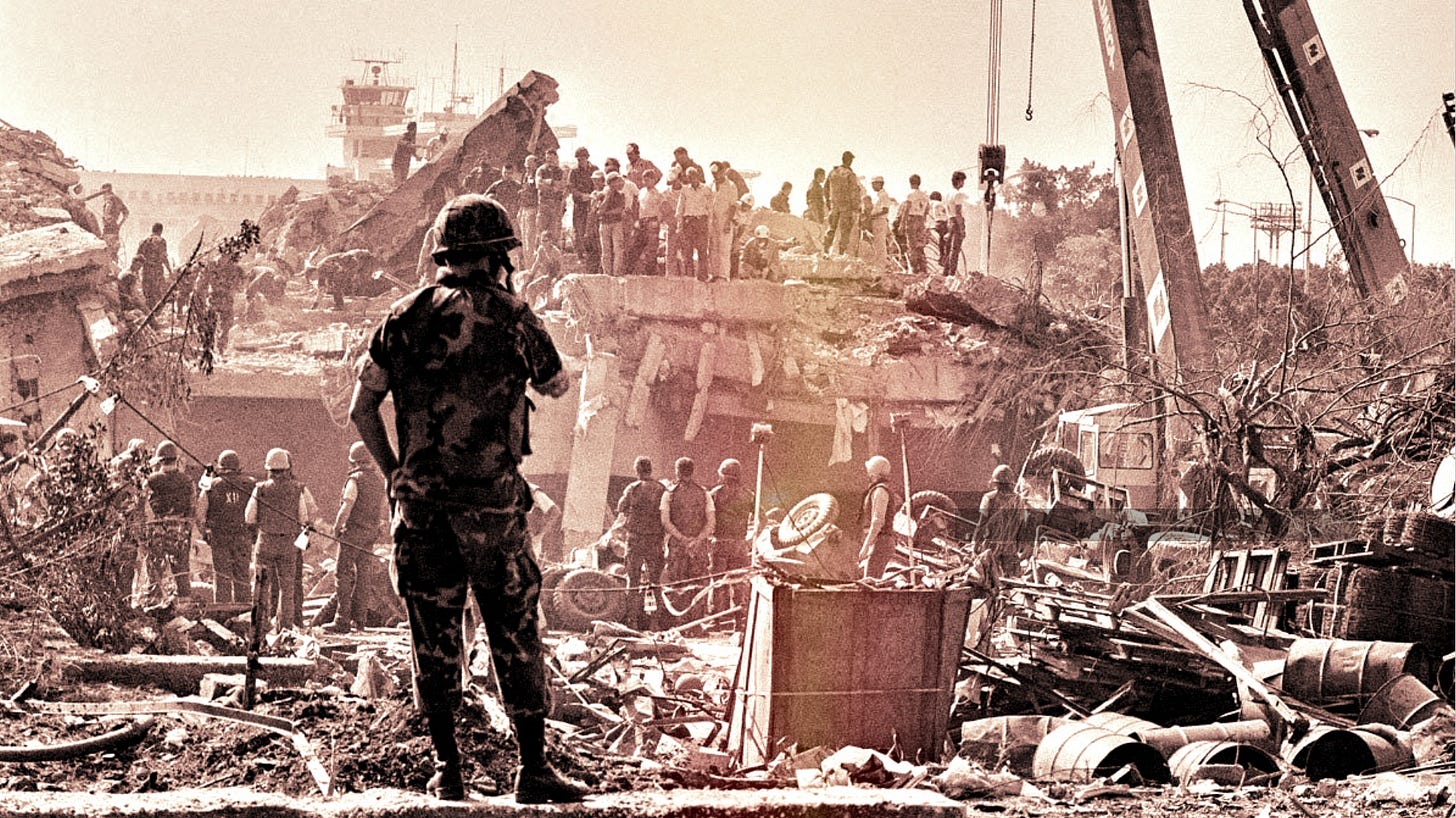 Over at the Port of Beirut, at 6.32am, the French Paratroopers of the United Nations Multinational Force (MNF) are involved in desperate rescue attempts of their own, as their barracks has also been destroyed by a truck bomb, albeit a device half the size of the one that has leveled the Marines’ BLT building. In all, fifty-eight French paratroopers are killed, along with six civilians.
