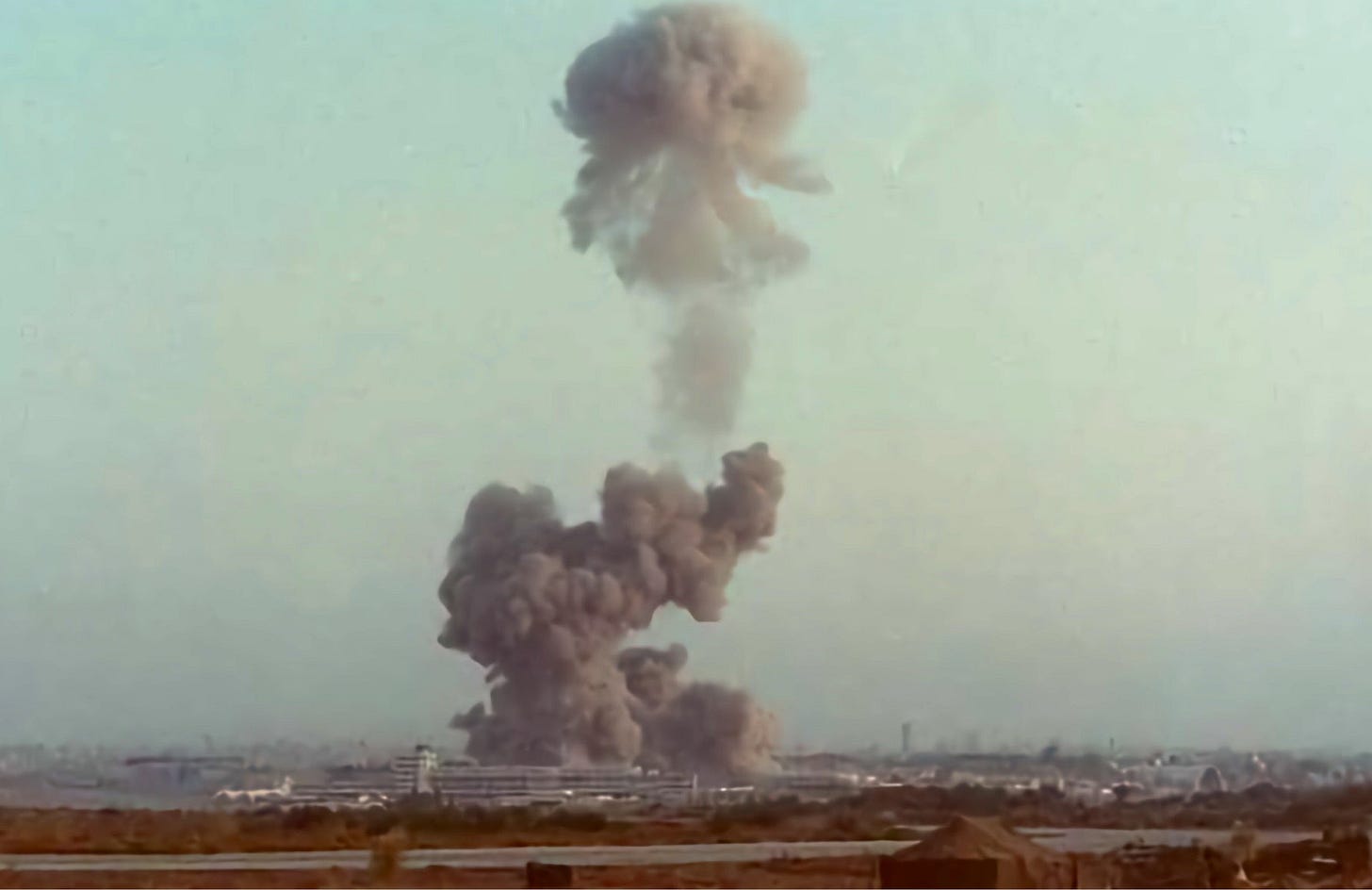 Four kilometers away, set up before dawn on a hill with a clear view of the airport, a man with a camera takes a picture thirteen seconds after he hears the penetrating thud of the massive blast, capturing the atomic-bomb-like mushroom cloud that rolls into the sky above the destruction.
